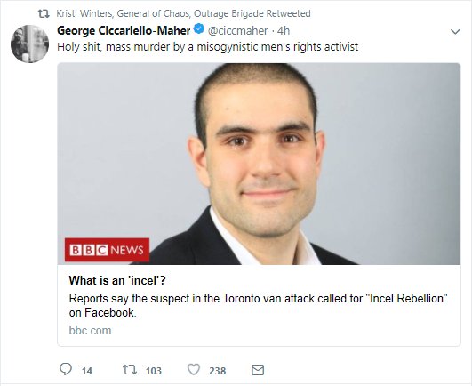 An Incel isn't even MRA wtf lol.https://twitter.com/MEMESofVIOLENCE/status/988922572015259648 …