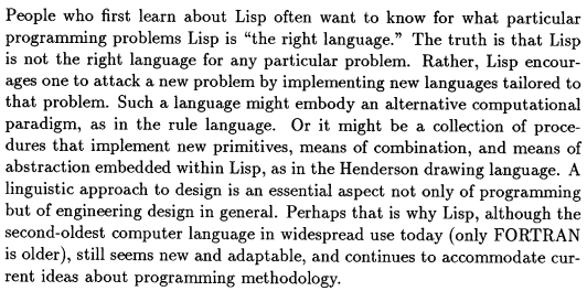 "Lisp encourages one to attack a new problem by implementing new languages tailored to that problem." https://dspace.mit.edu/bitstream/handle/1721.1/6064/AIM-986.pdf …pic.twitter.com/s2Hr1pDrgk