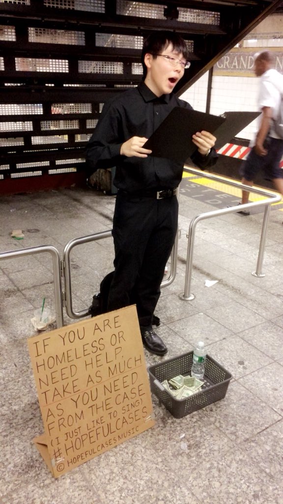 Just saw this young boy singing in Grand Central with this sign- the world isn’t all bad