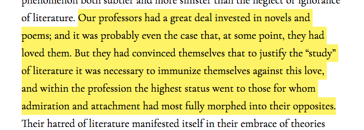 An excellent - and hopefully controversial - meditation on loving literature, and on stifling that love in pursuit of political and intellectual security, by