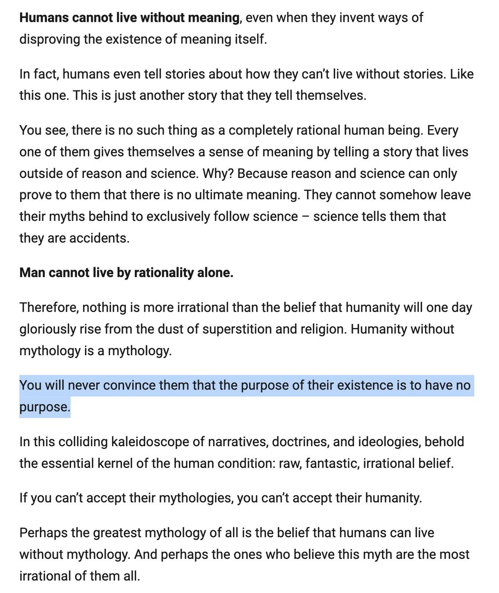 > You will never convince them that the purpose of their existence is to have no purpose https://connectom.substack.com/p/the-story-of-the-storytellers?token=eyJ1c2VyX2lkIjoxMDU4NTI1LCJwb3N0X2lkIjozNDExMDAwMCwiXyI6ImdoVHFMIiwiaWF0IjoxNjE2NDM1OTEyLCJleHAiOjE2MTY0Mzk1MTIsImlzcyI6InB1Yi0yMjA3NiIsInN1YiI6InBvc3QtcmVhY3Rpb24ifQ.QKb-r8zvn9ChwBrnrOl-2R_HZ60_4or5h50338WxAiM …pic.twitter.com/XHeVjrbLwW