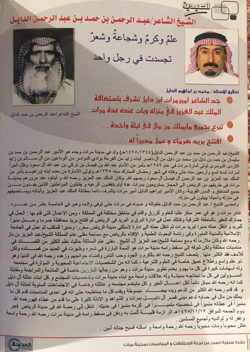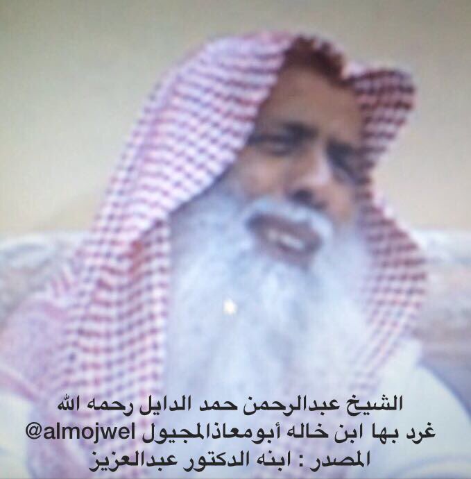 ٢٥٢- ابن العمة عبدالرحمن حمد الدايل ولد بمرات ١٣٤٤ونشأ بها انتقل للعمل مبكرا لعدد من المدن كان آخرها الجامعة الإسلامية ورئاسة البحوث وكان من خاصة الشيخ ابن باز ولثقته به يحيل عليه كثير من المعاملات كان كريما محبوبا وعنده يلتقي الأحبة ومن حسن خاتمته وفاته فجرالجمعة ٢٥ / ١١ / ١٤٢٥pic.twitter.com/qWk6Ea7W1y