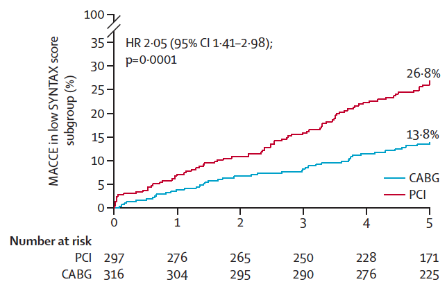 #NOBLE, the weirdest finding is the performance of the SYNTAX score (HR 2.05 with PCI vs CABG in the low risk stratum). So, if your SYNTAX score is low: CABG. If we try, we can find either a sense or the play of chance. But it's time to reconsider this tool.pic.twitter.com/wXCjykvSoK