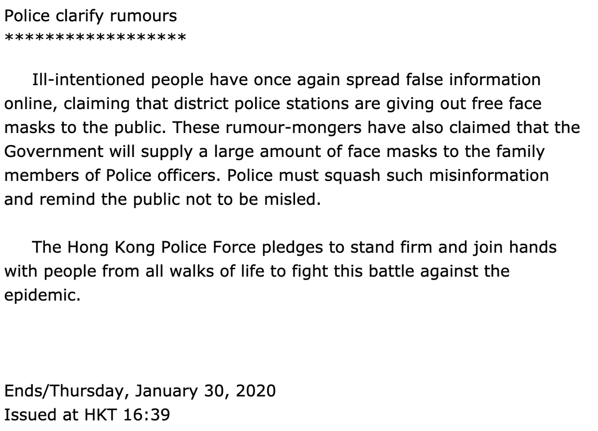 Police have clarified that news of district police stations giving out free face masks to the public is actually false information spread by "ill-intentioned people" https://www.info.gov.hk/gia/general/202001/30/P2020013000490.htm …pic.twitter.com/5TFiNcKA2k