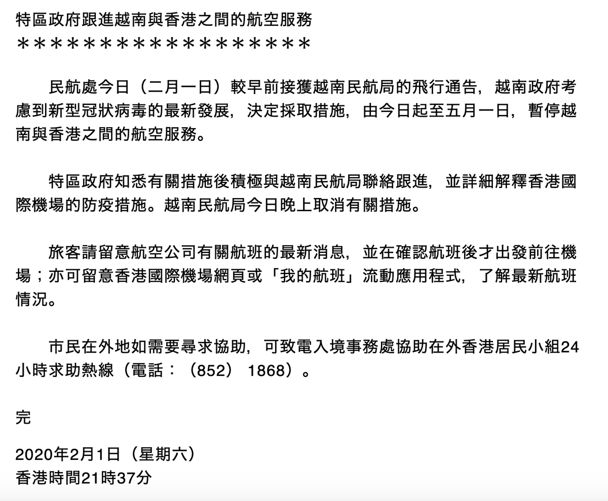 The government has confirmed that they contacted their Vietnamese counterparts to explain the anti-epidemic measures in place at Hong Kong International Airport, and Vietnamese aviation authorities then reversed their decision to suspend flights between the country and Hong Kongpic.twitter.com/oEtHWJWY1k
