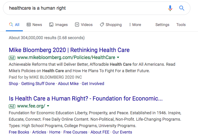 Disgusting paid ads when you Google "healthcare is a human right"pic.twitter.com/7OikPoVX3x