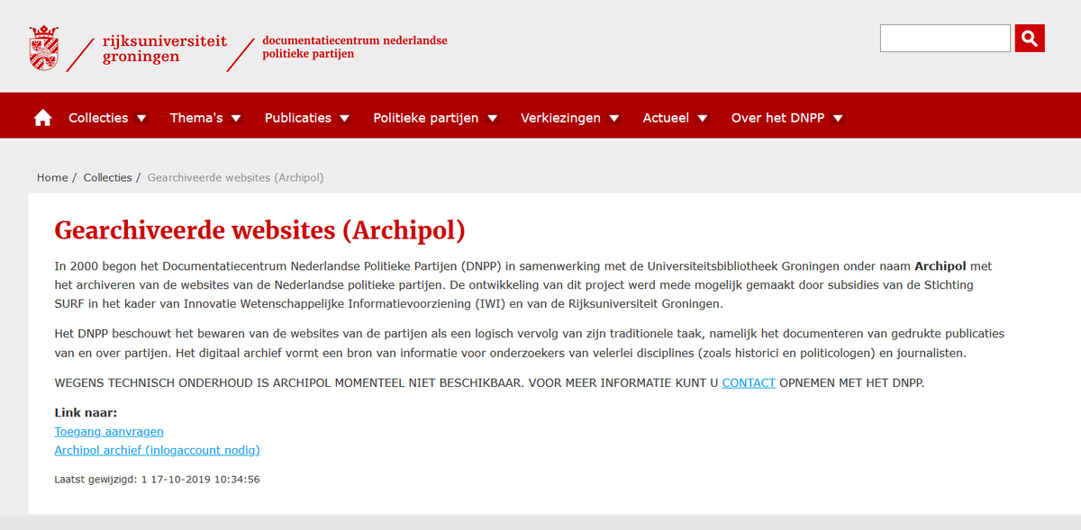 #webarchive Archipol@DNPP_RUG@Bibliothecaris@univgroningen!#Webarchiving in the Netherlands started 20 years ago in January 2000 in#Groningen when the first sites of political parties were added to the "#cyberarchive"#webarchivingwednesdaypic.twitter.com/qLwCP90rsd