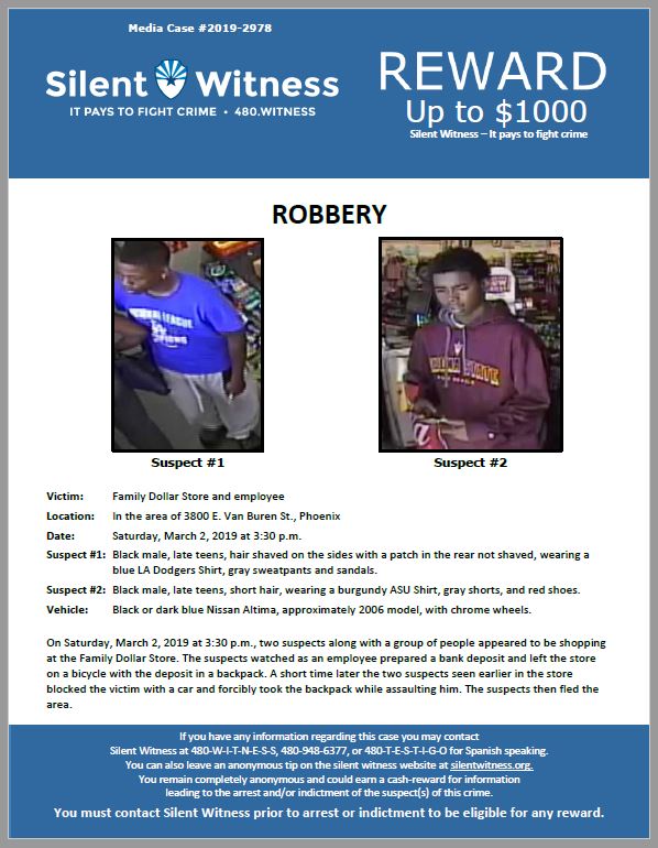 Do you recognize these suspects that committed a robbery at a Family Dollar in Phoenix? If you have any info about the suspects and want to remain anonymous call 480-WITNESS/480-TESTIGO You could be eligible for up to $1,000 CASH reward! http://ow.ly/7Z7430oxxTs pic.twitter.com/oLiEIwN6Um