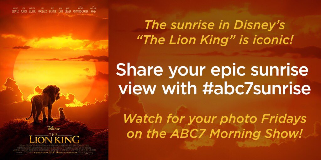 @disneylionking - and to celebrate the film’s release in theaters July 19, we want to see your sunrise photos! Share them with#abc7sunrise. We'll be showing them on the@ABC7 Morning Show every Friday this month!pic.twitter.com/3rtT3FvahD