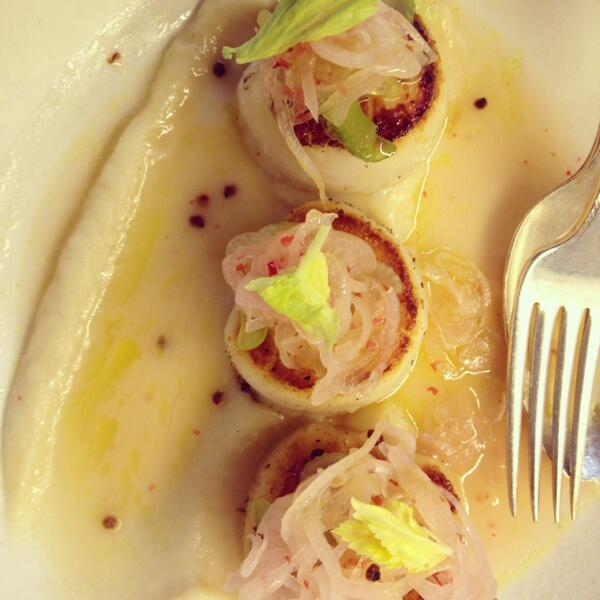 Dinner delights from @ABCKitchen | Maine scallops, maple-celeriac puree & pink peppercorn vin. | pic.twitter.com/sqveZcHH3n @dan_kluger