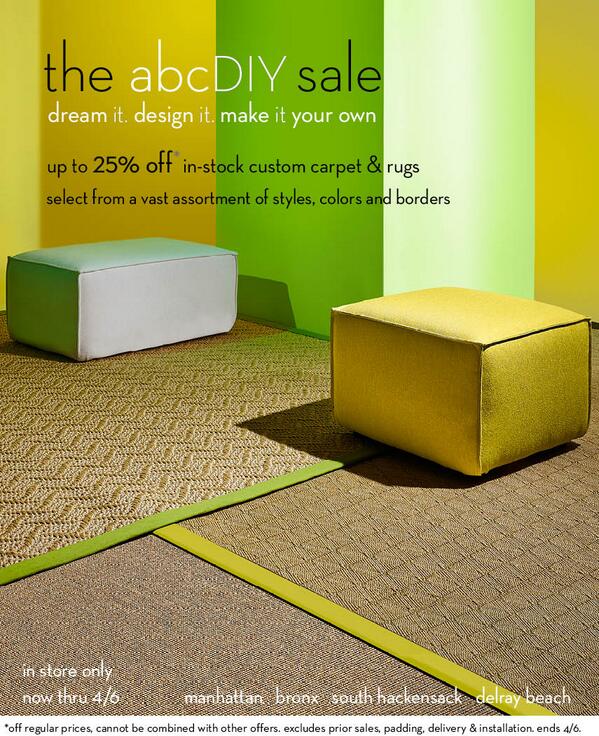 Our abcDIY #sale event continues -- 25% off in-stock custom carpets & rugs. #DreamIt #DesignIt #MakeItYourOwnpic.twitter.com/9OtFyAl4uU