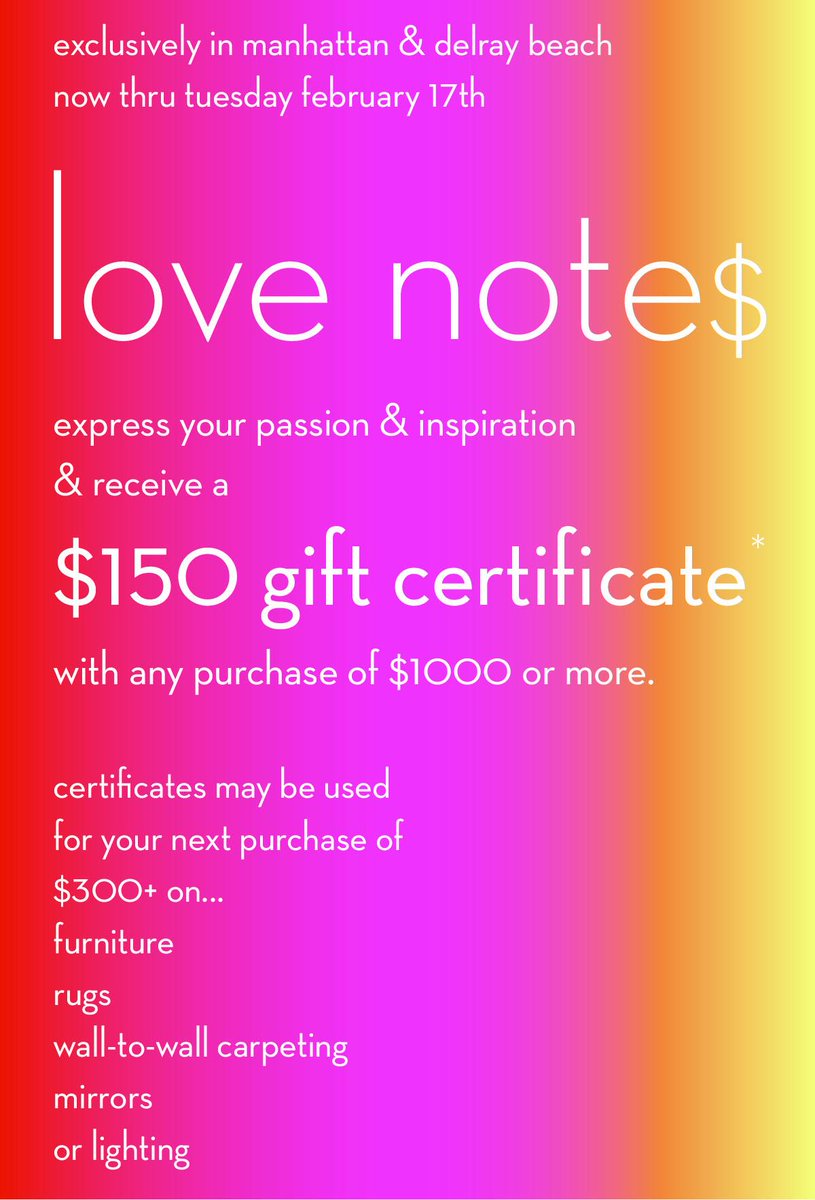 Now through Tuesday in #Manhattan & #DelrayBeach, receive $150 gift certificate with purchase of $1000pic.twitter.com/S64RWvRv0i