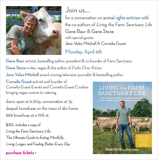 Join us in welcoming @genebaur of @FarmSanctuary April 6, 6:30pm #DeepakHomebase