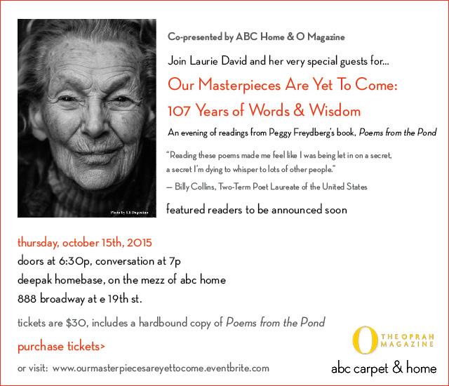 TOMORROW Join @Laurie_David & @OMagazineSA at @abchome for #poetry from Peggy Freydberg http://bit.ly/1F5biLg pic.twitter.com/vqhLl9G7tF