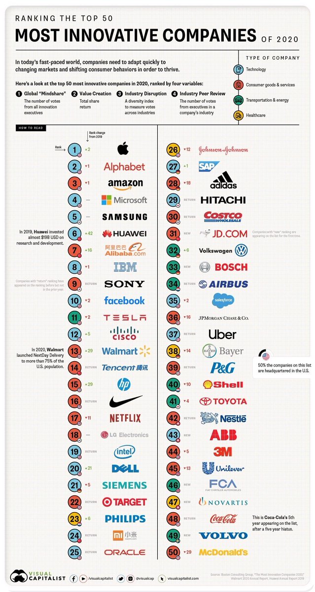 Classement des entreprises les plus innovantes dans le monde en 2020 effectué par