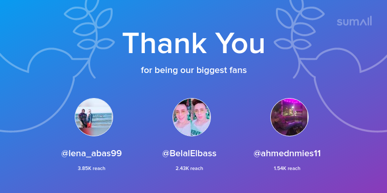Our biggest fans this week: lena_abas99, BelalElbass, ahmednmies11. Thank you! via https://sumall.com/thankyou?utm_source=twitter&utm_medium=publishing&utm_campaign=thank_you_tweet&utm_content=text_and_media&utm_term=ed22f66ab801f35cdca66da8 …pic.twitter.com/9aSv27uBmo