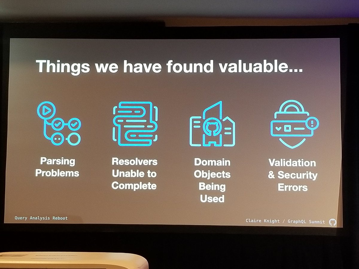 @GitHubAPI tracks malfomed queries, graphql, domain, and validation & security errors in order to dig deeper on the usage of their APIs and how clients are using (or misusing) them." -@krider2010#graphqlsummitpic.twitter.com/NL0DWnxURq