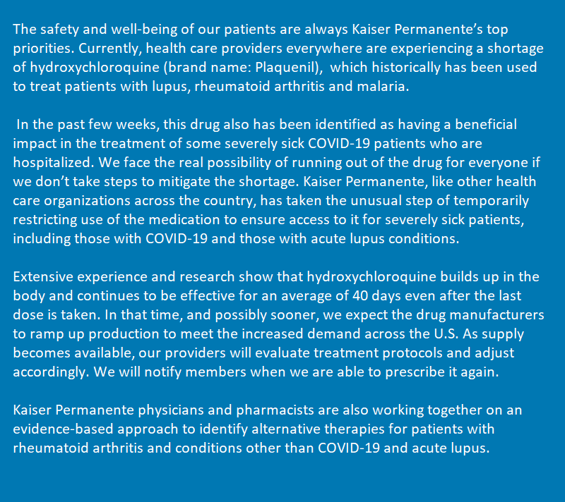 Kaiser Permanente is discontinuing routine chloroquine prescriptions for lupus, rheumatoid arthritis, and malaria patients to deal with a shortage driven by #covid19, and thanking them for their "sacrifice" https://www.buzzfeednews.com/article/tanyachen/kaiser-permanente-lupus-chloroquine … via @tanyachen and @dvergano