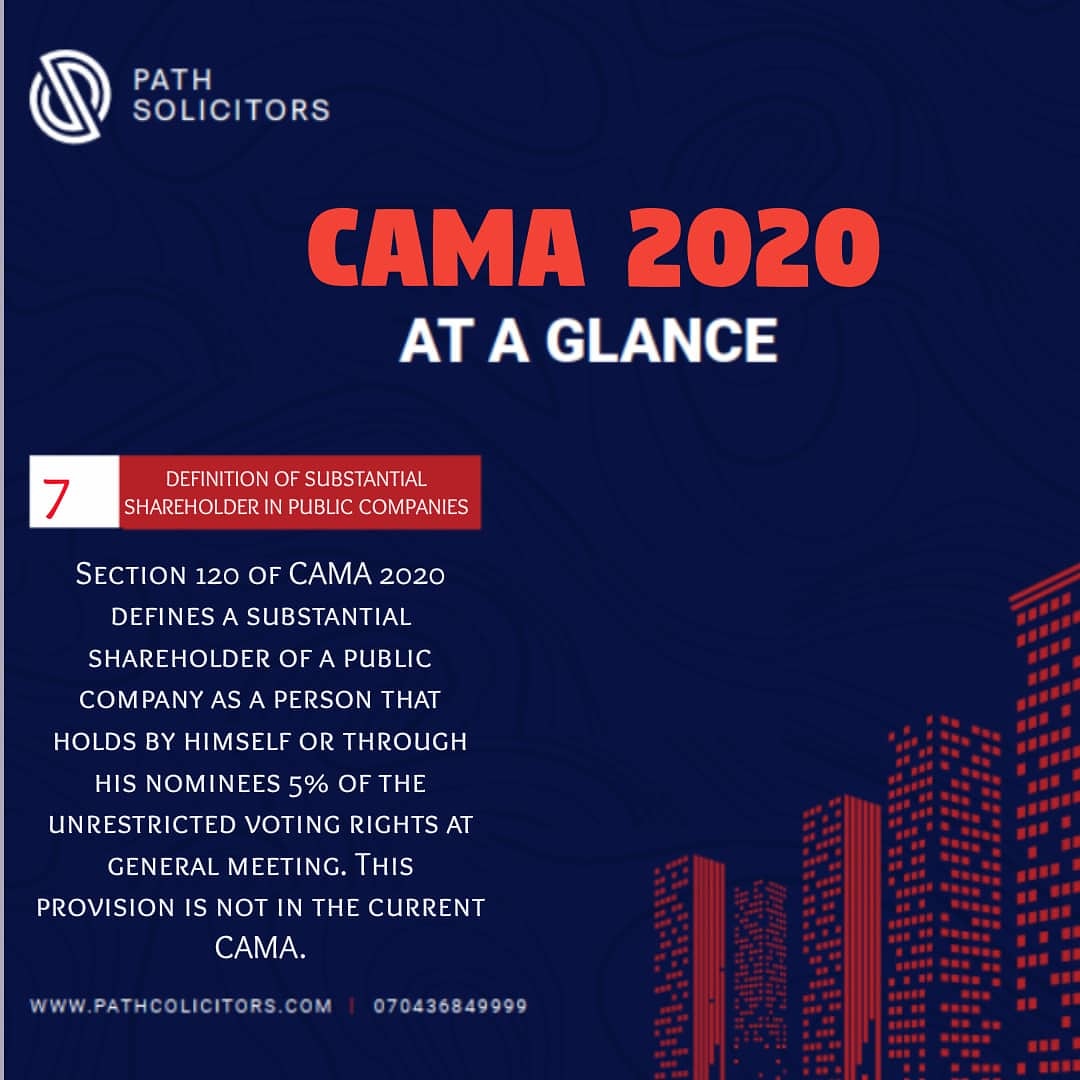 CAMA 2020 AT A GLANCE-7 DEFINITION OF SUBSTANTIAL SHAREHOLDER Section 120 defines a substantial shareholder of a public company as a person that holds by himself or through his nominees 5% of the unrestricted voting rights at General Meeting, this provision is not CAMA 1990pic.twitter.com/8tuEcF6EGu