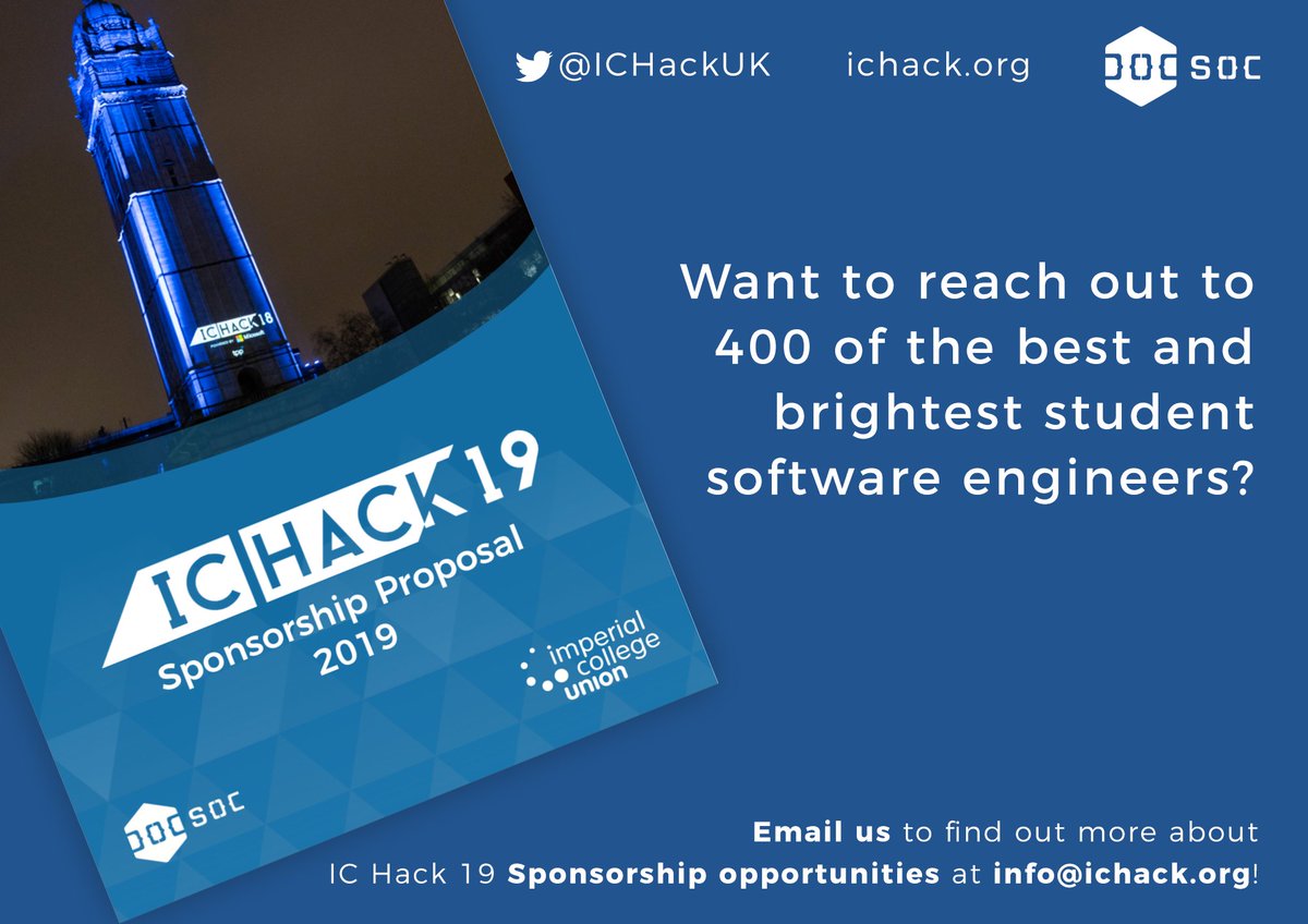 Want to promote your company to the next generation of leading software engineers? IC Hack 19, the UK's largest student-run hackathon, is being held on 26-27th January 2019 at Imperial College's South Kensington Campus. Send an email to info@ichack.org to find out more!pic.twitter.com/H6mj00e1dm