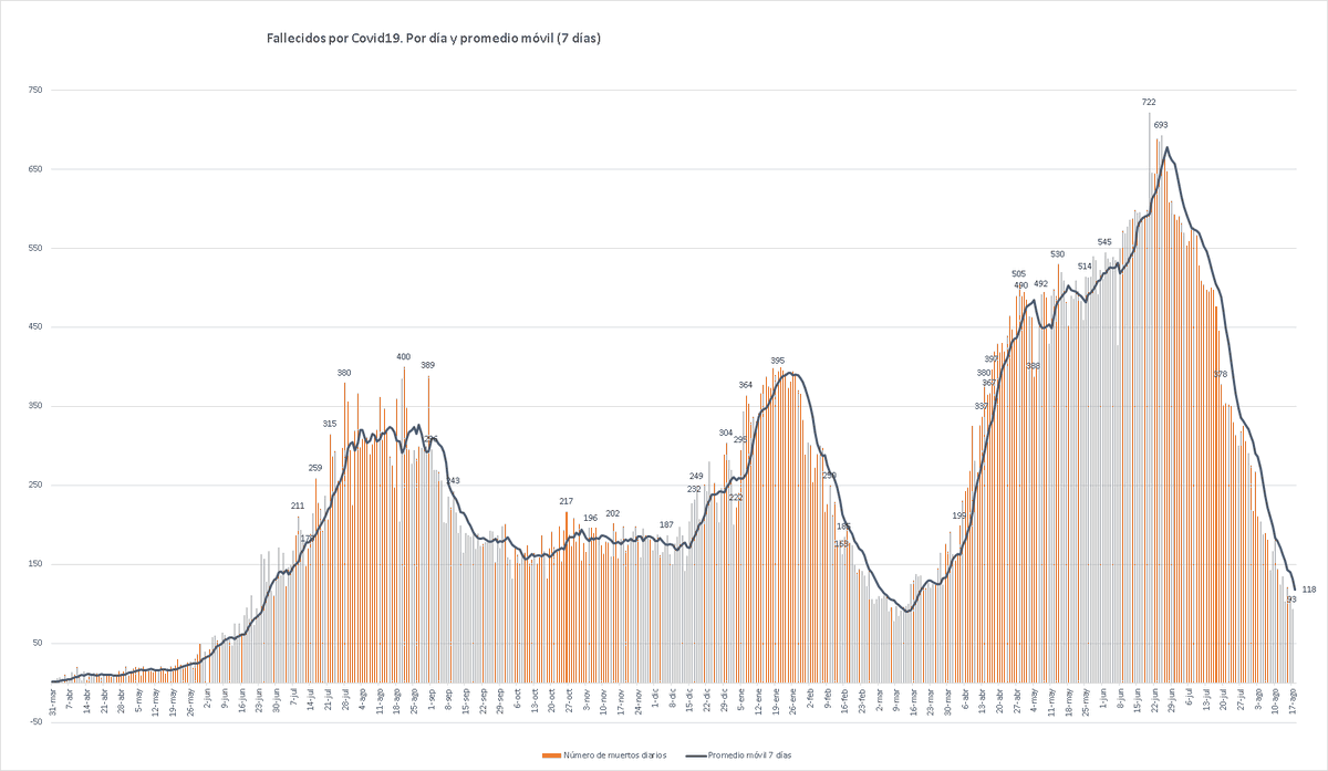 Hoy se reportaron menos de 100 fallecidos: 93. Primera vez que eso sucede desde el 14 de marzo. El promedio móvil (de 7 días) está en 118, la cifra más baja desde el 19 de marzo.pic.twitter.com/ClhRpNWos2