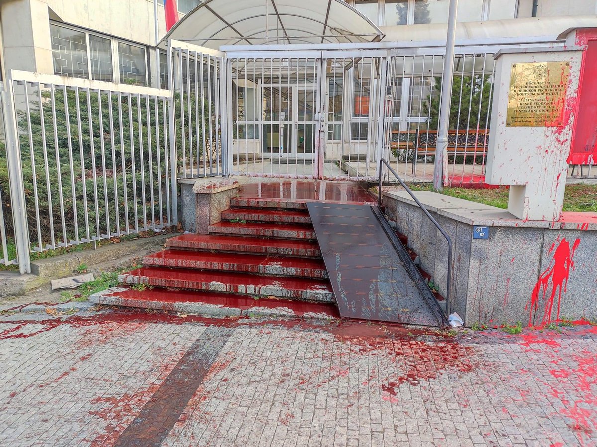 HOW WE TREAT TERRORISTS IN PRAGUE: Entrance to the Russian Embassy in Prague after some unmarked volunteer citizen on vacation accidentaly spilled over some paint expressing how we see this terrorist state. We hope Russian Embassy will soon cease to exist in Prague.pic.twitter.com/itkkqqfqhg