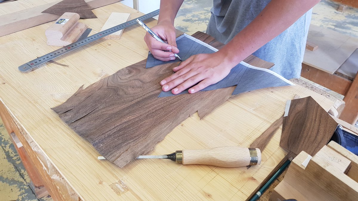 La séance du jour des 2ème année de CAP ébéniste : décoration personnalisée du plateau d'un bout de canapé. Le placage dans toutes ses formes et ses essences !