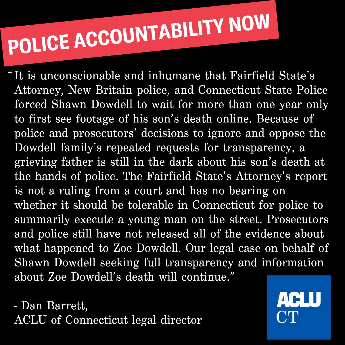 Prosecutors and police still have not released all of the evidence about what happened to Zoe Dowdell. Our legal case on behalf of Shawn Dowdell seeking full transparency and information about Zoe Dowdell’s death will continue.https://www.acluct.org/en/press-releases/reaction-fairfield-states-attorneys-report-deadly-shooting-zoe-dowdell-new-britain …