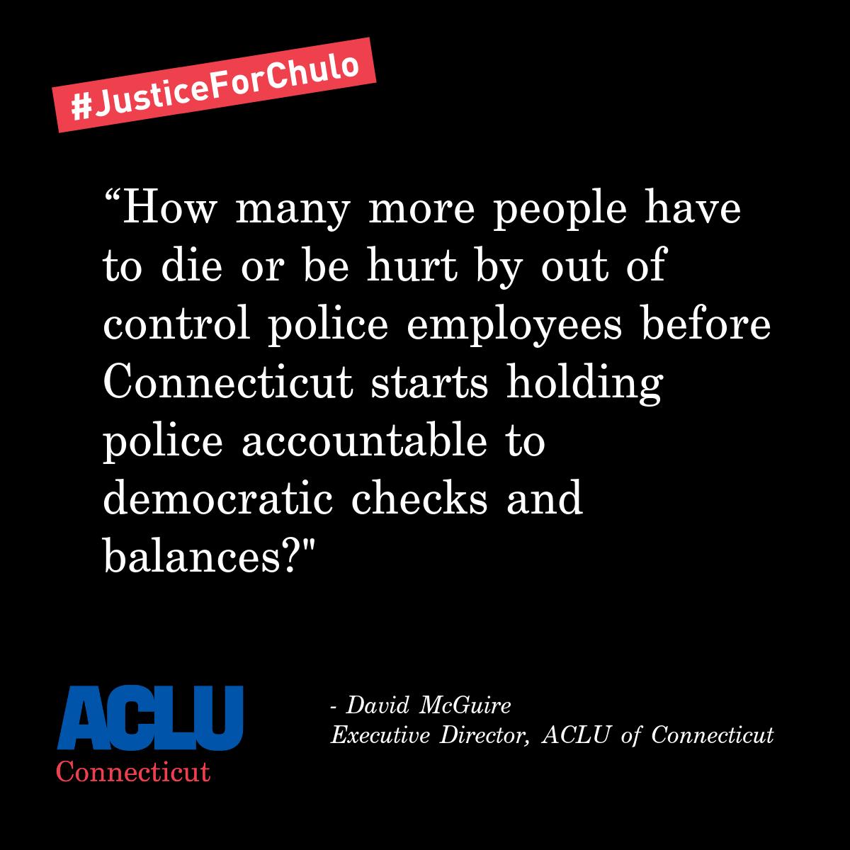 Today, the Hartford State's Attorney released some footage of Wethersfield police shooting & killing Anthony "Chulo" Vega. Chulo Vega should still be alive today, and police violence against people of color in Connecticut is a pandemic. Our statement: https://www.acluct.org/en/press-releases/video-wethersfield-police-violence-against-anthony-chulo-vega-shows-need-democratic …pic.twitter.com/cJRD7r6d5M