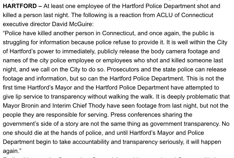 Hartford police shot and killed a person last night. No one should die at the hands of police, and it is within the Mayor and Hartford Police Department’s power to immediately release footage & the names of the city police employee or employees involved. Our statement:pic.twitter.com/p3h8JHki2a