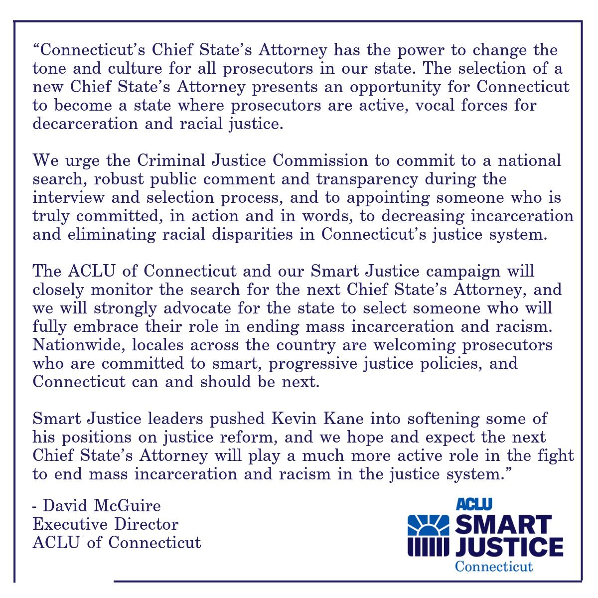 "Smart Justice leaders pushed Kevin Kane into softening some of his positions on justice reform & we hope and expect the next Chief State’s Attorney will play a much more active role in the fight to end mass incarceration & racism in the justice system.”https://www.acluct.org/en/press-releases/statement-regarding-search-next-connecticut-chief-states-attorney …