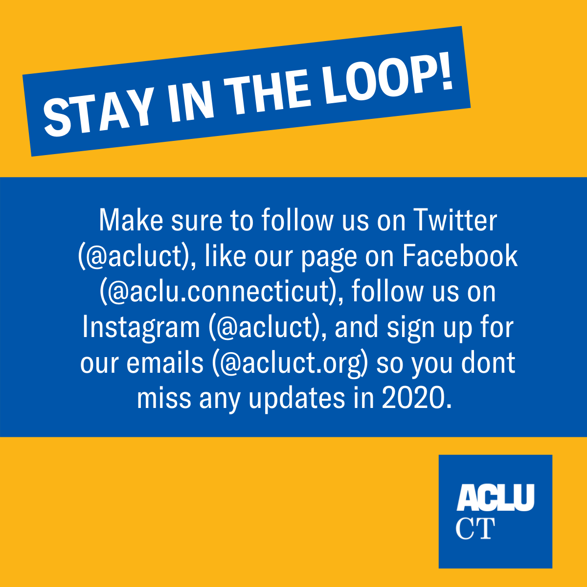 Make sure to follow us on Twitter (@acluct), like our page on Facebook (@aclu.connecticut), follow us on Instagram (@acluct), and sign up for our emails (http://www.acluct.org ) so you don't miss any updates in 2020!