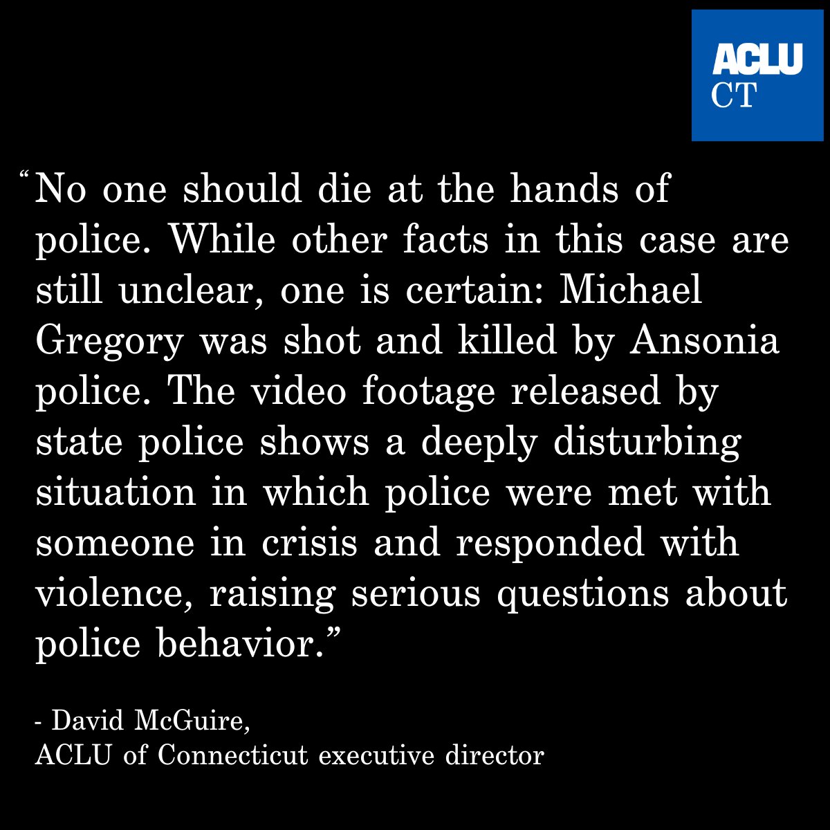 No one should die at the hands of police. The footage released today of Ansonia police shooting and killing Michael Gregory is deeply disturbing and raises serious questions about police behavior. Our statement: https://www.acluct.org/en/press-releases/statement-regarding-release-footage-deadly-shooting-ansonia-police …pic.twitter.com/P8X6eilVCJ