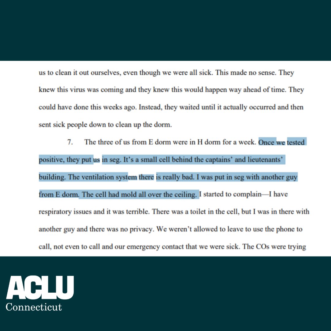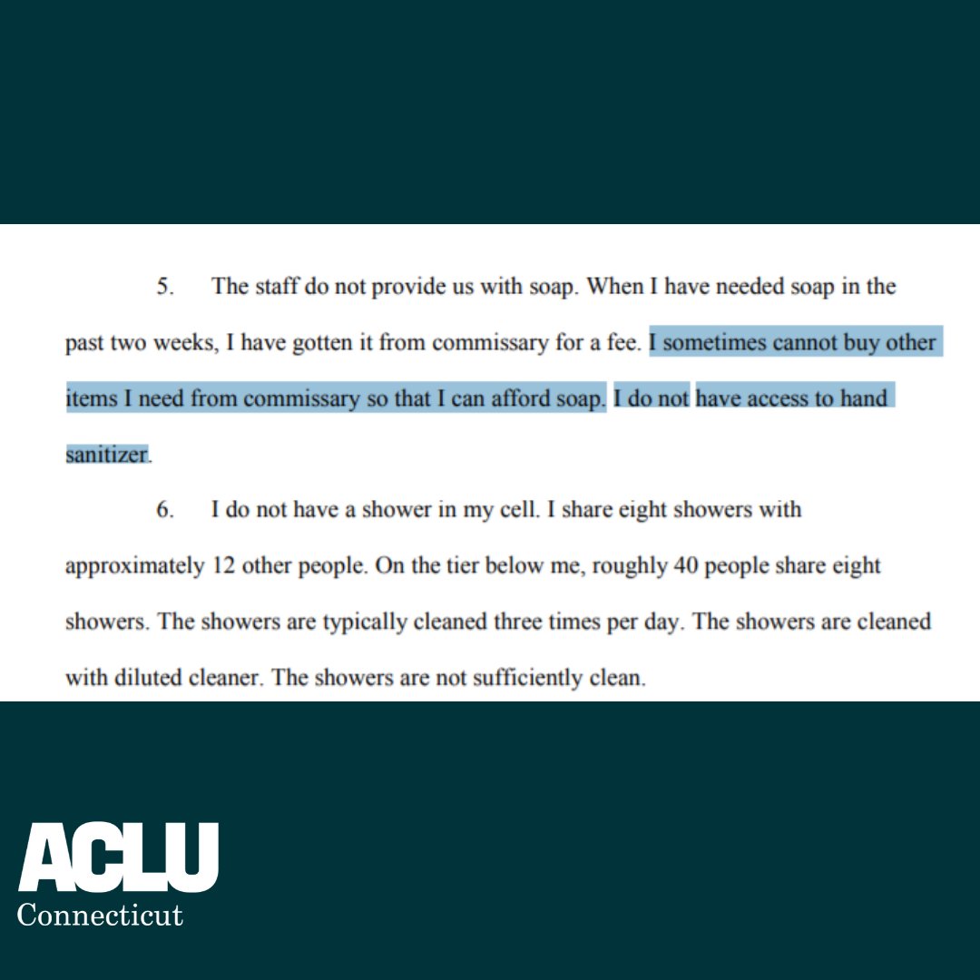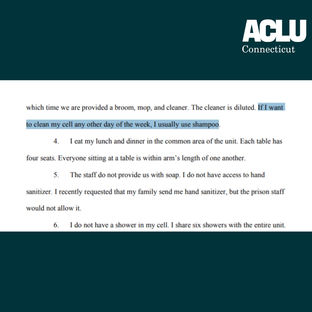 Instead of taking actions to prevent the spread of COVID-19 in prisons and jails, the DOC’s response has kept people in danger and at times made it worse. The stories coming from people living and working in Connecticut prisons and jails are horrific. https://www.acluct.org/sites/default/files/2020-4-22_acluct_exhibits_in_further_support_of_motion_for_temporary_order_of_mandamus.pdf …