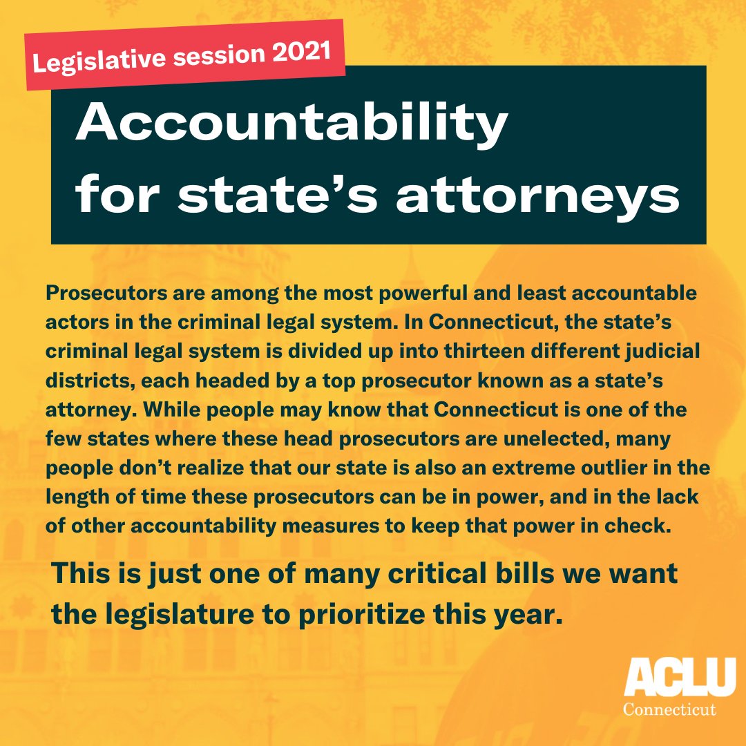 State’s Attorneys are some of the most powerful and least accountable actors in the criminal legal system. This year, the ACLU of CT’s Smart Justice campaign will be advocating for legislators to pass a bill to start holding State’s Attorneys accountable. https://www.acluct.org/en/news/legislative-session-starts-january-6-heres-what-were-fighting …pic.twitter.com/EkvZy3yKrL