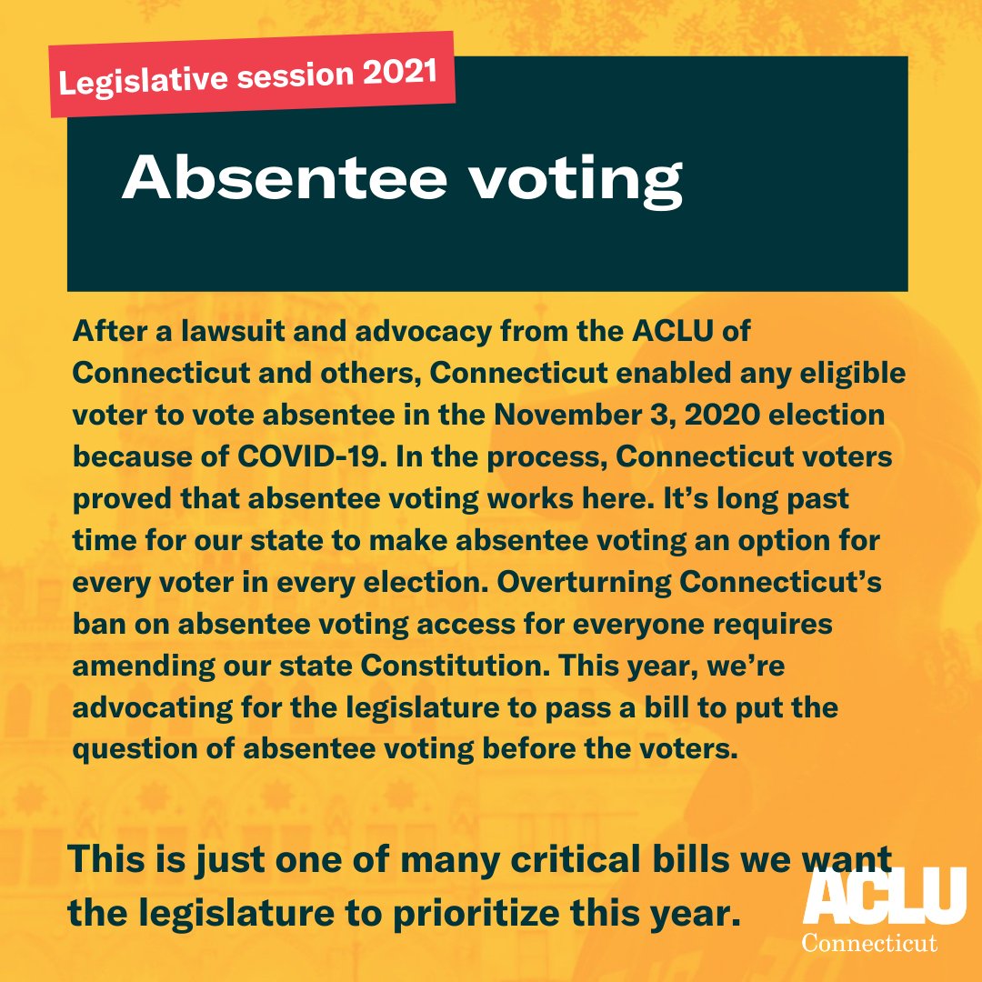 Despite a short turnaround and high-pressure election, opening absentee voting to all CT voters for the Nov. 3, 2020 election was a huge success. This year, we’re advocating for the legislature to pass a bill that would put the question of absentee voting before voters in 2022.pic.twitter.com/XAf6ND56kY