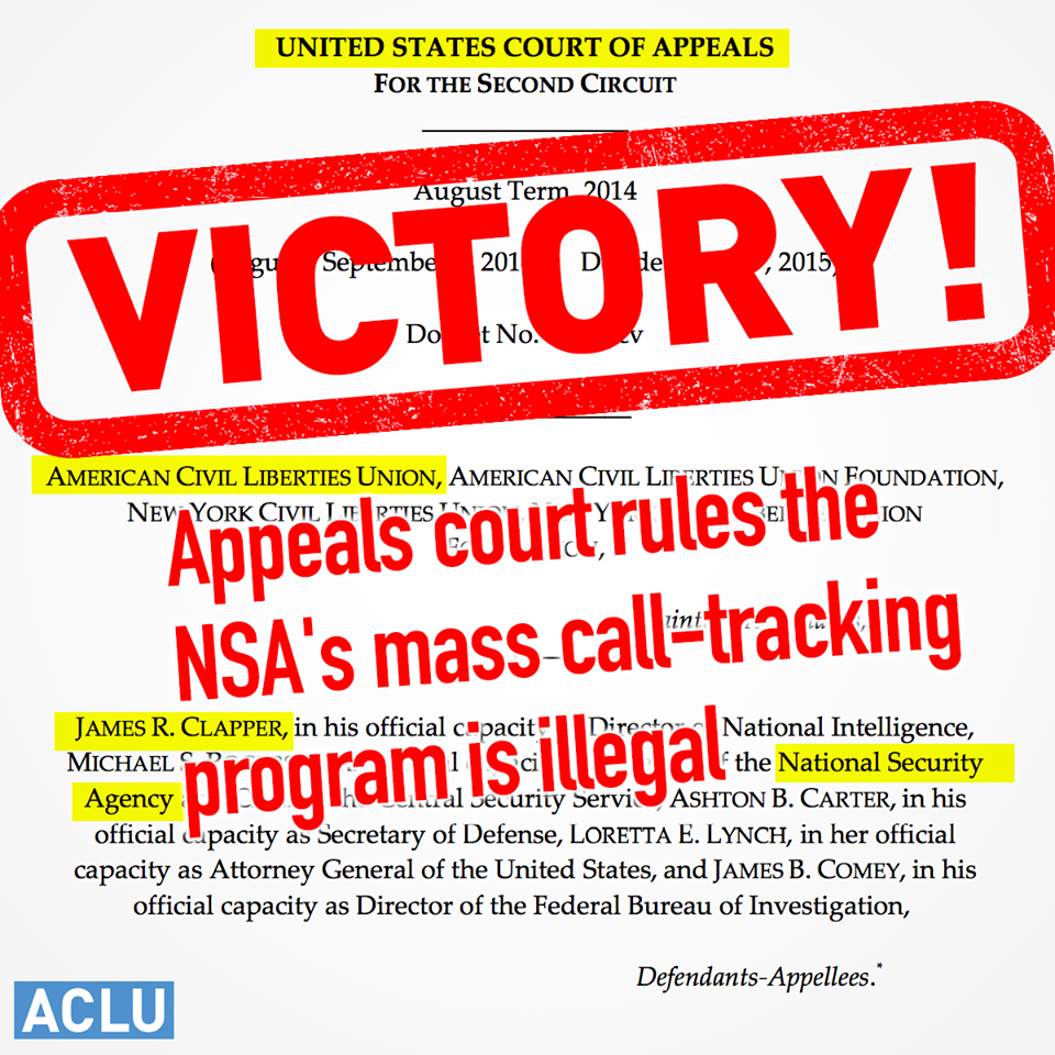 Appeals Court Strikes Down NSA Phone Spying Program! http://www.acluct.org/updates/appeals-court-strikes-down-nsa-phone-spying-program/ …pic.twitter.com/yTYwUndx8H