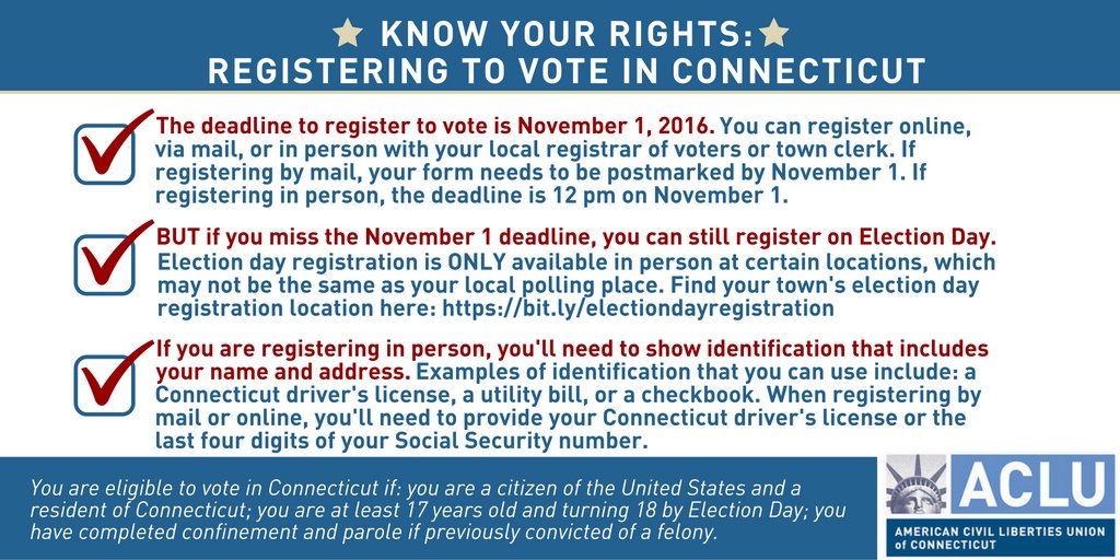Know your rights if you're registering to vote tomorrow. http://www.acluct.org/updates/know-your-voting-rights/ … #Election2016pic.twitter.com/IcuP0TRYTR