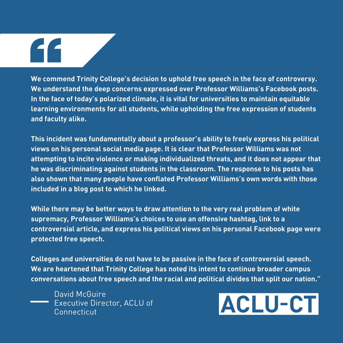 Our statement regarding Trinity College's decision to retain Prof. Johnny Williams after social media controversy: http://www.acluct.org/updates/statement-trinity-college-decision-to-retain-professor-after-social-media-controversy …