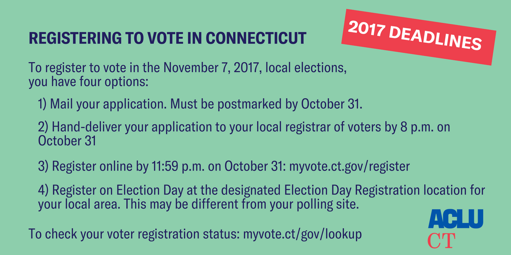 CT: Local elections are on Nov. 7. To vote, you must be registered by TODAY (unless you're registering on Election Day). #HappyHalloweenpic.twitter.com/EEuCjP3wlr