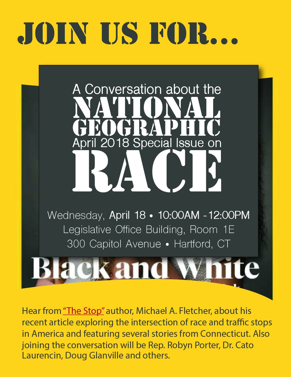 Join us 4/18 to hear from @espn's @Fletchpost, #NewHavenCT's & #CTLeg's @Porter4DaPeople, @uconnhealth's & @UConnCICATS's Cato Laurencin, @NBCSChicago's & @nytimes's @dougglanville, & others on @NatGeo's #RaceIssue - incl. on the intersection of #race & traffic stops. #IDefineMe pic.twitter.com/Vyu34Gp2CG