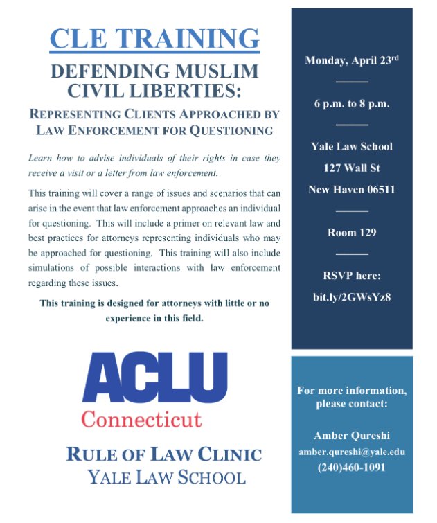 Muslim leaders in Connecticut have expressed concern about an increase in visits by the FBI. Join us on Monday (4/23) at 6 pm in #NHV for a free workshop to learn how to defend Muslims' rights if the FBI comes to call. Attorneys who attend are eligible for CLE credit.pic.twitter.com/m9u71k7rZH