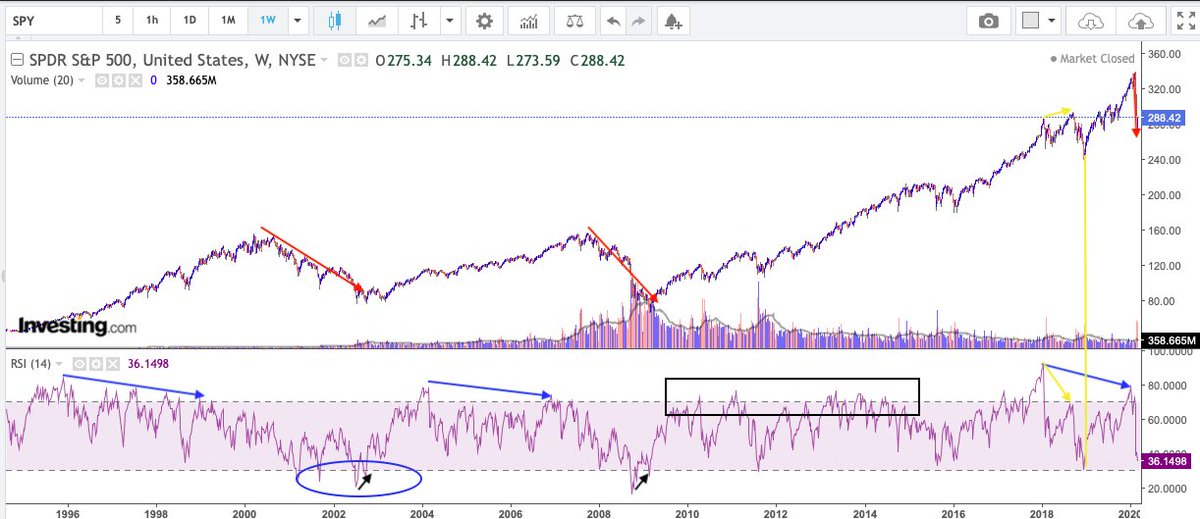 $SPY weekly chart. 2 moments were RSI was extremely overbought showed there were always a discrepancy between price and RSI. The other times RSI touched the overbought area. All times market grew.pic.twitter.com/aa0982riBw
