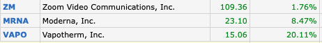 $ZM - helps communications in distance 2 -$MRNA - vaccines for diseases, in this case coronavirus 3 -$VAPO - helps people breed. All other stocks crashing. If$VAPO continues to soar I might reduce position and increase other.pic.twitter.com/1OJPVGakUM