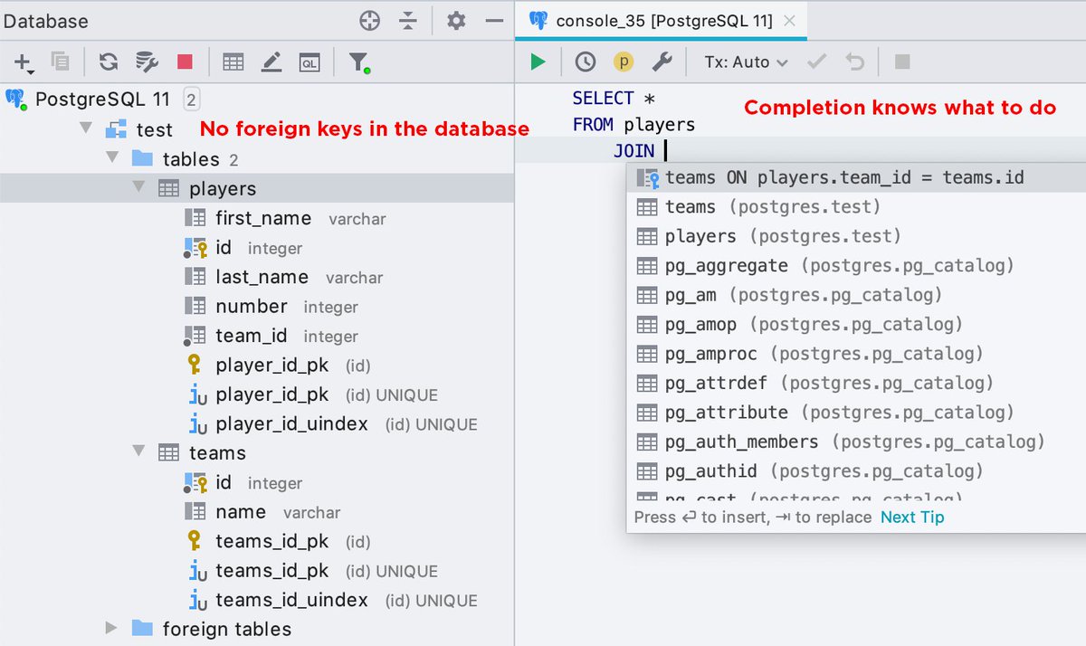 Now DataGrip can create virtual foreign keys! Check out our blog-post about DataGrip 2019.3.2: https://blog.jetbrains.com/datagrip/2020/01/22/datagrip-2019-3-2-virtual-foreign-keys-and-more/ …pic.twitter.com/DyoOGGPQyI