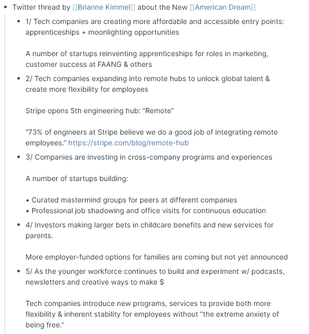 A few examples of my own. - Pasting Twitter threads - Reading list - Writing down what I'm thinking vs just third party info - Connecting blog content by