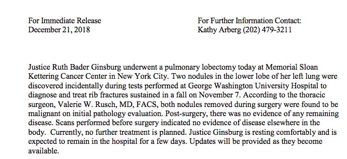 Justice Ginsburg underwent a pulmonary lobectomy to remove malignant nodules in her left lungpic.twitter.com/dzcVOzEv4O