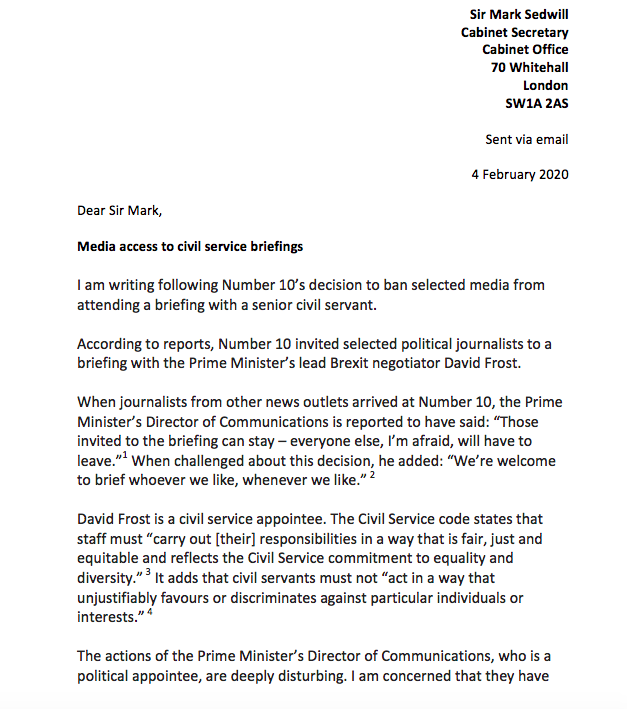 Keir Starmer writes to Sir Mark Sedwill asking him to "investigate urgently" the decision by Downing St to ban some media from a civil service briefing He says it “undermined the civil service’s ability to comply with its core values of integrity, objectivity and impartiality"pic.twitter.com/63vBd4EU64