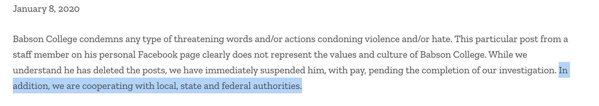 What they apparently *actually* reported to the police was the possibility that there might be media coverage. (https://www.bostonglobe.com/metro/2020/01/22/academics-authors-come-defense-fired-babson-college-employee/sHPN83Wm7U8WXWMKyt689K/story.html …). In that sense, I am also "cooperating" with law enforcement through inaction.pic.twitter.com/zMsjZw5Q67