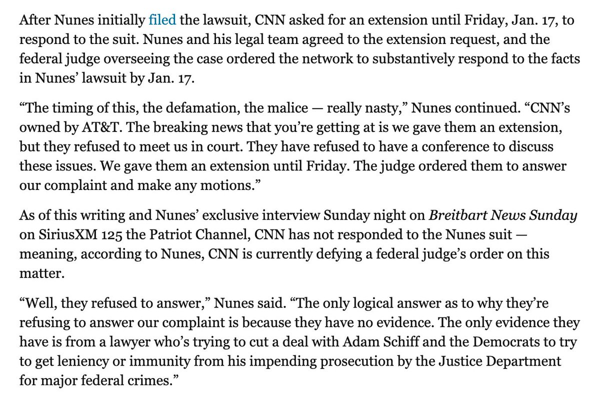 [thinking emoji] https://www.breitbart.com/politics/2020/01/19/exclusive-devin-nunes-cnn-in-defiance-of-federal-judge-order-to-respond-to-defamation-lawsuit/ … https://www.courtlistener.com/recap/gov.uscourts.vaed.461302/gov.uscourts.vaed.461302.13.1_1.pdf …pic.twitter.com/cHLDco7Q3X